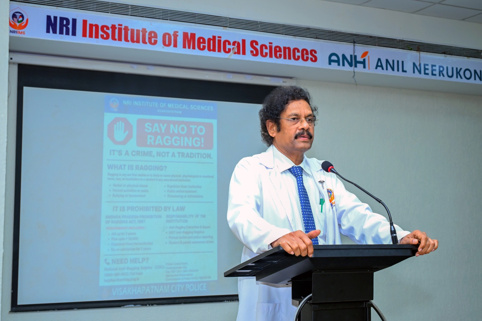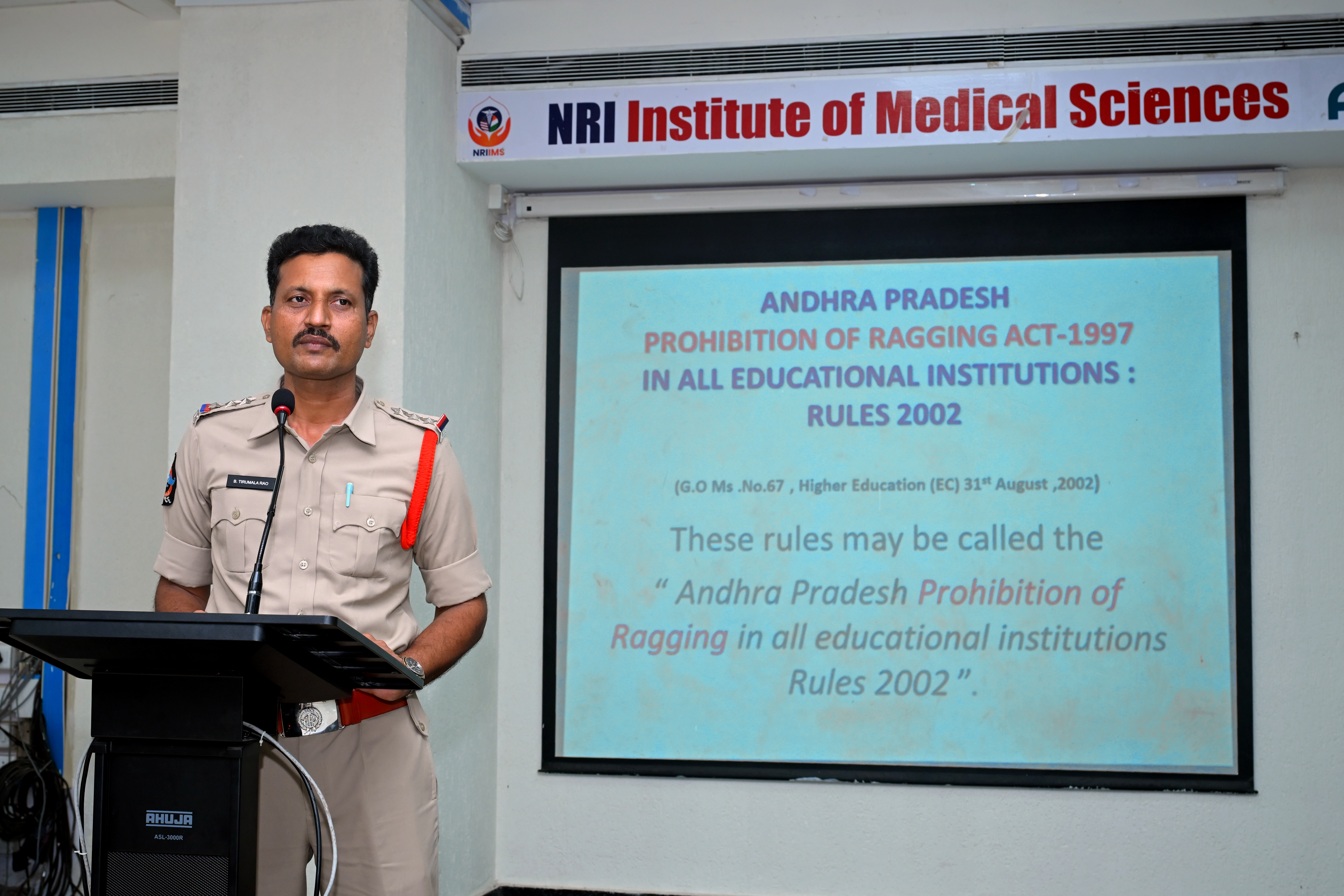 As per the directions of NMC and UGC, the Anti Ragging Week was inaugurated on 12.08.2025. Dr. P V Sudhakar, DEAN-NRIIMS has presided over the meeting. Mr. B. Tirumala Rao, made a Power Point presentation of the Anti Ragging Act including the Punishments of violation of the Act. About 400 students from all streams have participated along with the Members of Anti Ragging Committee of the Institution.