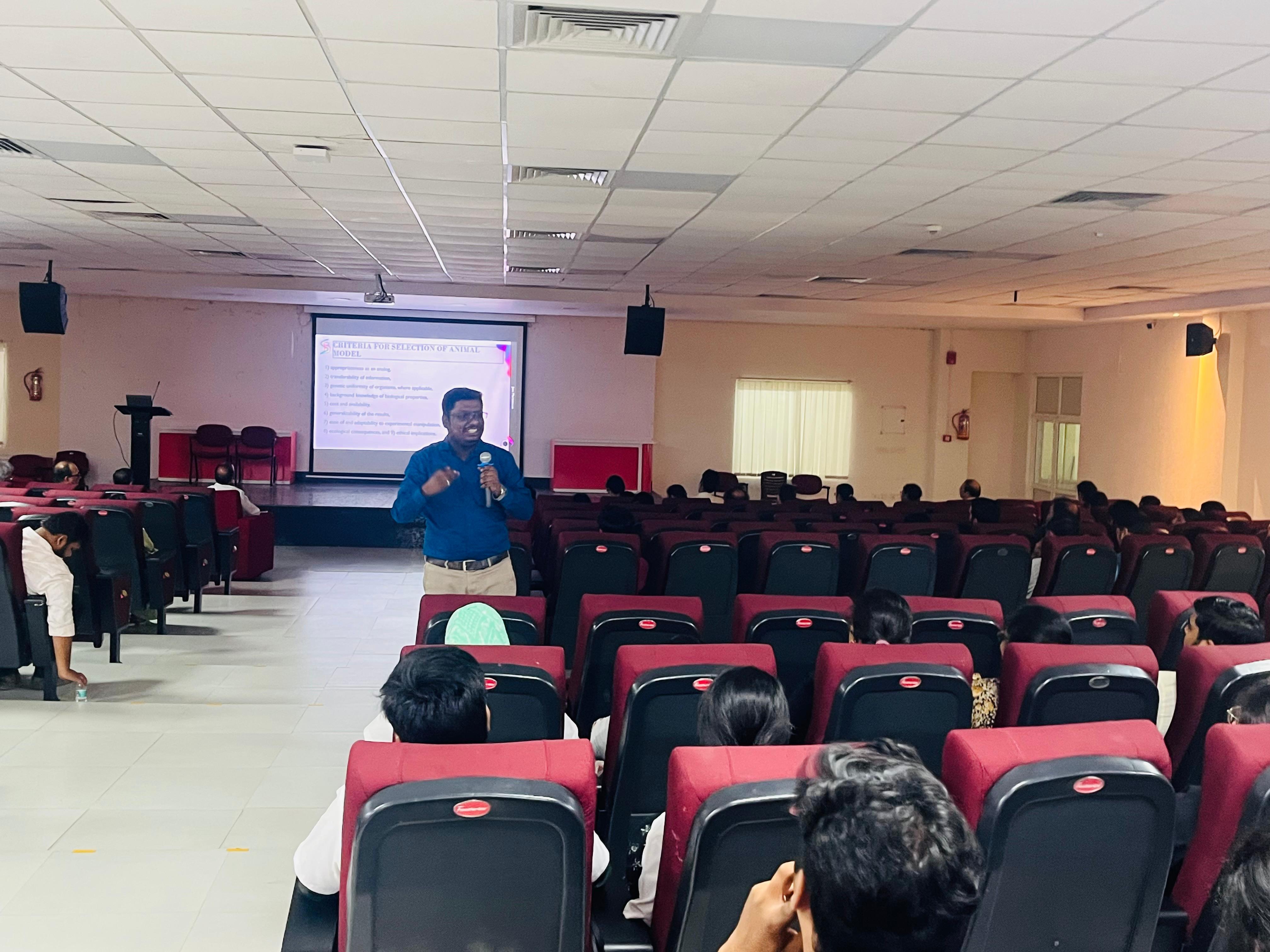 The Department of Pharmacology, NRIIMS conducted Guest lecture on “Alternative to animal experiments” to the Postgraduate Students and faculty on 20th November 2025 from 2pm to 4pm at Dr. Yellapragada Subbarao lecture gallery, 6 th floor, ANH. The program started with inauguration and lighting of the lamp by our Principal Dr. A. Bhagyalakshmi. This was followed by a brief Introductory lecture on Alternative to animal experiments by Dr. P. Jagadeesh, Professor and HOD, Pharmacology, NRIIMS. Dr. K. Ram mohan; Assistant professor introduced the guest speaker to the audience.